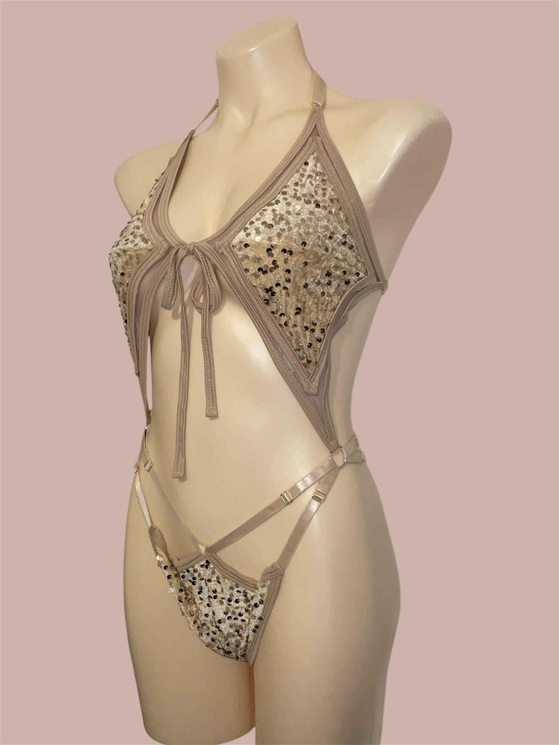 Baby bodysuit - Champagne Cloud – beige & gold sequins on creamy beige mesh